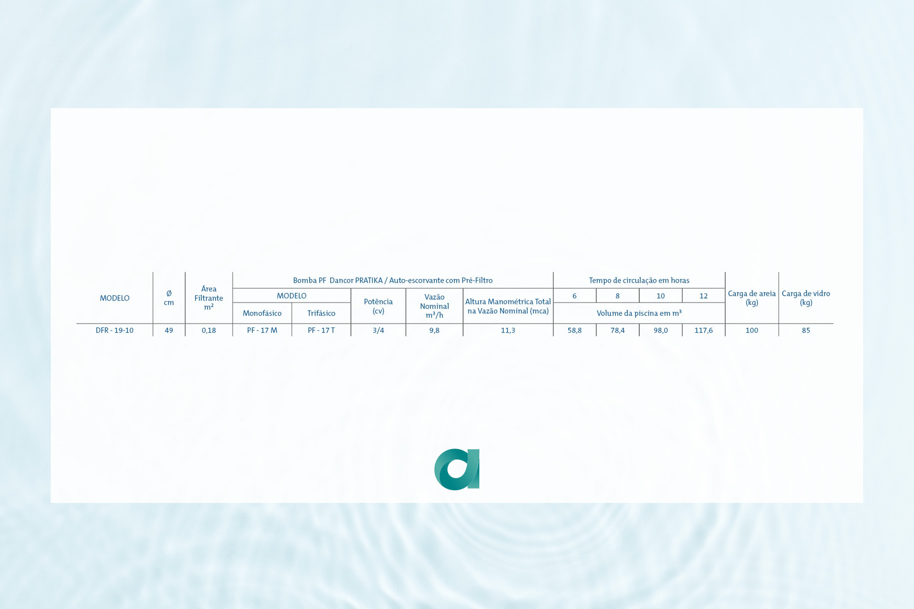 A Bomba para Piscina Dancor – DFR-19-10 entrega limpeza consistente com motor de 3/4 cv e vazão nominal de 9,80 m³/h, atendendo piscinas de até 78.400 L. O conjunto filtrante traz válvula seletora de 6 posições com manômetro e visor de retrolavagem, tanque rotomoldado com prisioneiros em inox e areia sílica dimensionada conforme ABNT. Feita em termoplástico de engenharia, trabalha com taxa de filtração de 880 a 1450 m³/(m²·dia) para manter a água sempre cristalina.