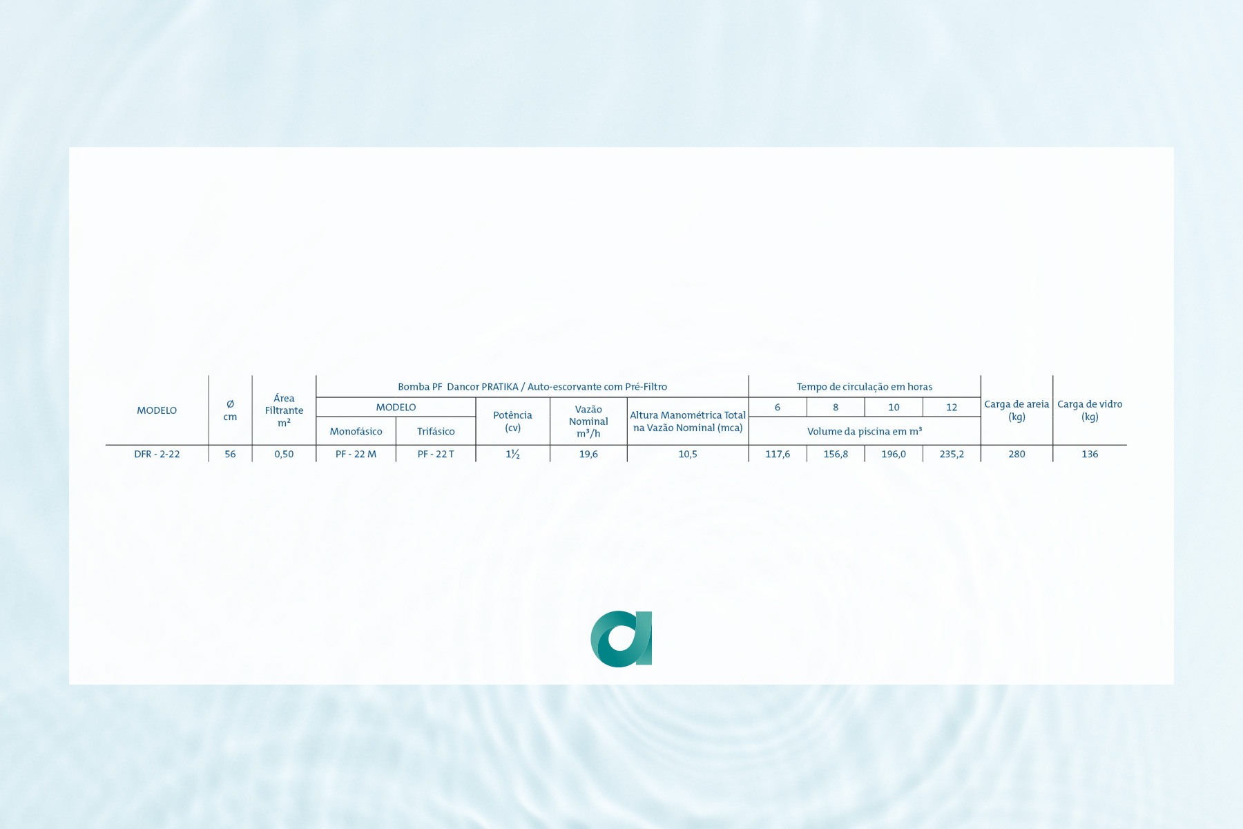 A Bomba para Piscina Dancor – DFR 2-22 atende piscinas grandes com motor de 1½ cv e vazão nominal de 19,6 m³/h, cobrindo volumes de até 156.800 L. O conjunto inclui válvula seletora de 6 posições com manômetro e visor de retrolavagem, tanque rotomoldado com prisioneiros em inox e areia sílica dimensionada conforme ABNT. Feita em termoplástico de engenharia, opera na faixa de 880 a 1450 m³/(m²·dia), garantindo circulação estável, limpeza eficiente e manutenção simples.