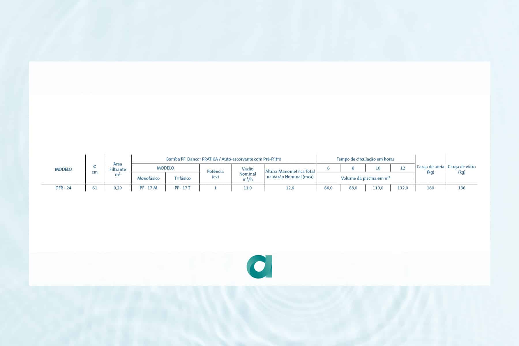 A Bomba para Piscina Dancor entrega filtragem prática e durável: válvula seletora de 6 posições com manômetro e visor de retrolavagem, tanque rotomoldado com prisioneiros em inox e areia sílica dimensionada segundo ABNT. Com componentes em termoplástico de engenharia, mantém a água cristalina, operando com taxa de filtração entre 880 e 1450 m³/(m²·dia).
