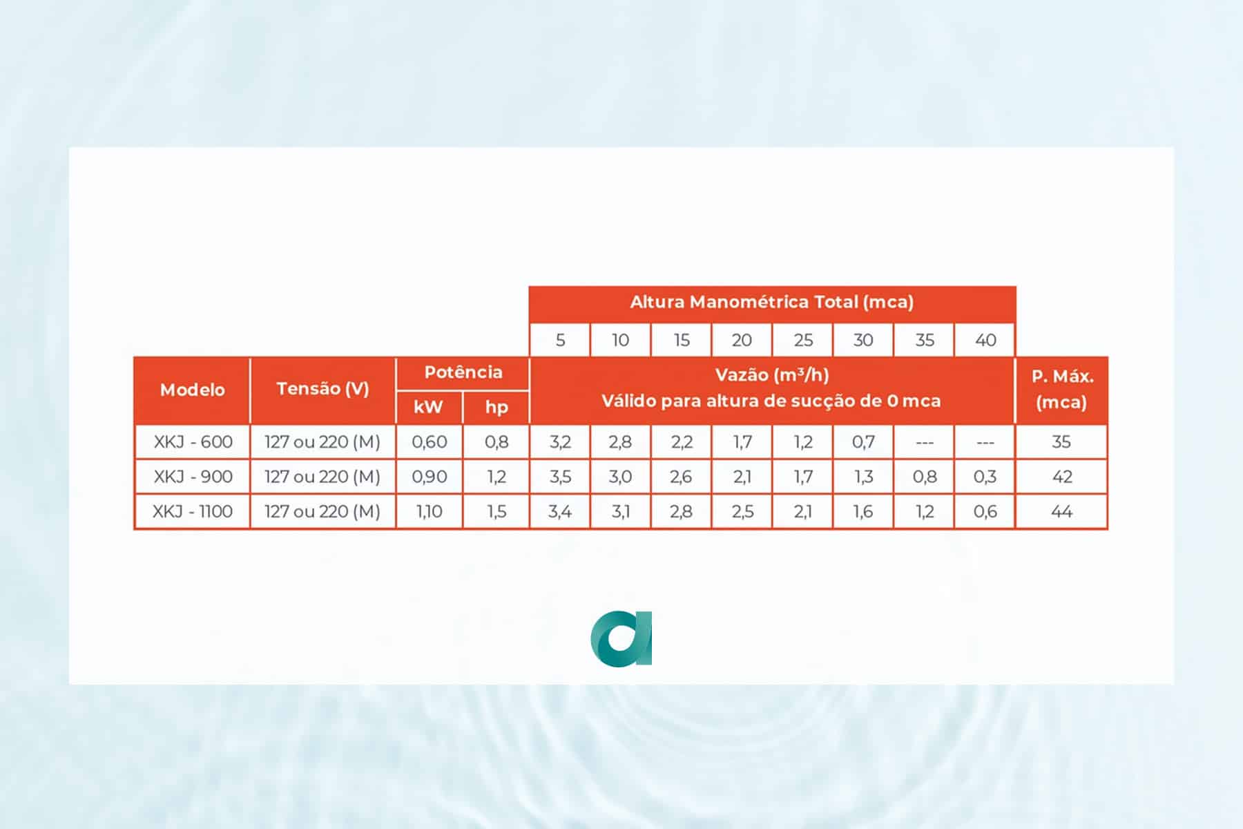- Altura máxima de sucção: 8 mca