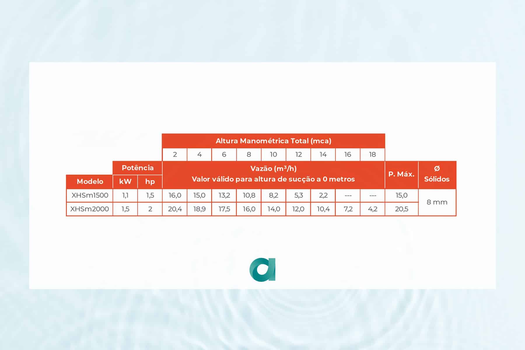 - Altura máxima de sucção: 8 mca