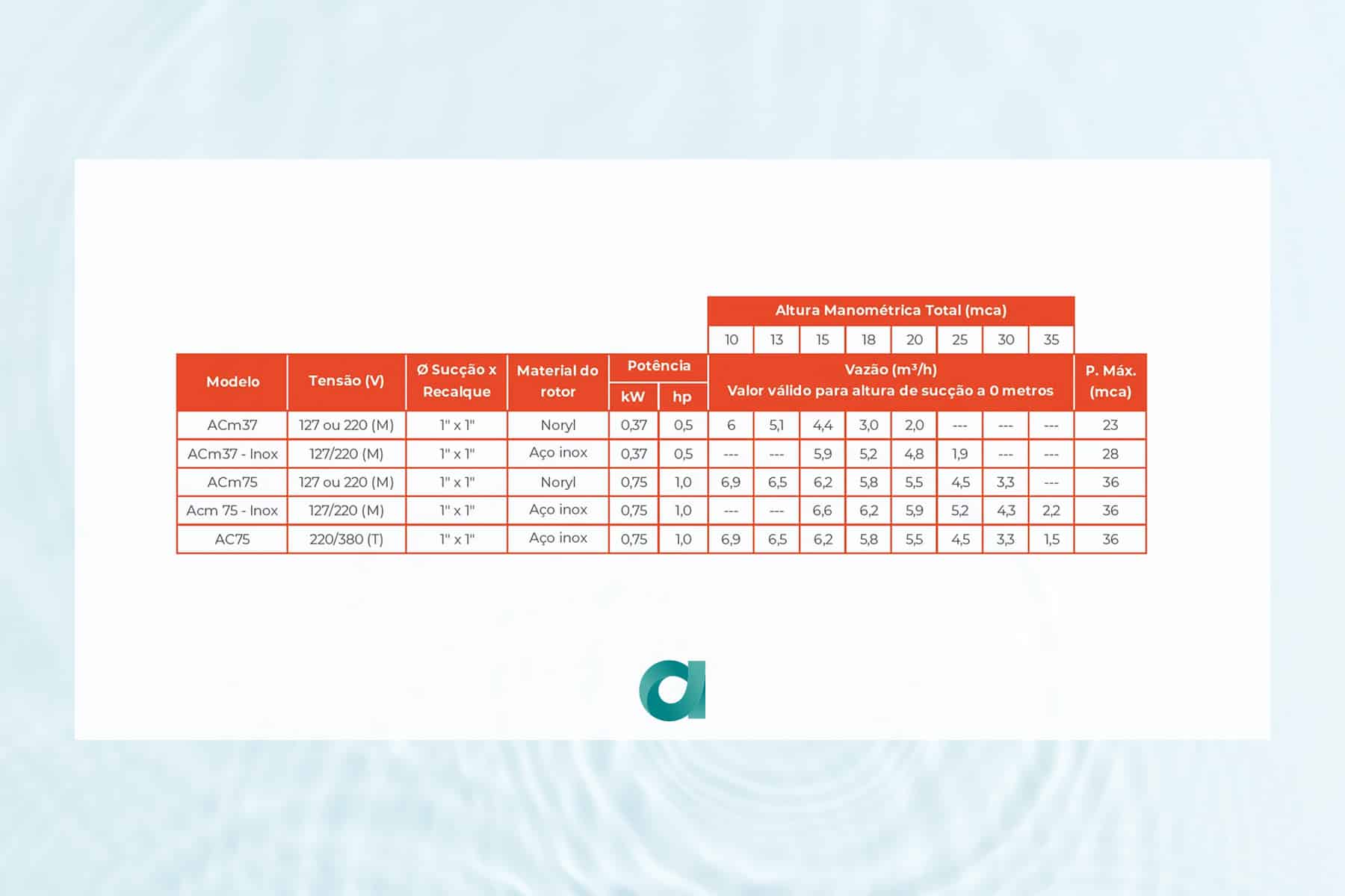 • Altura máxima de sucção: 8 mca