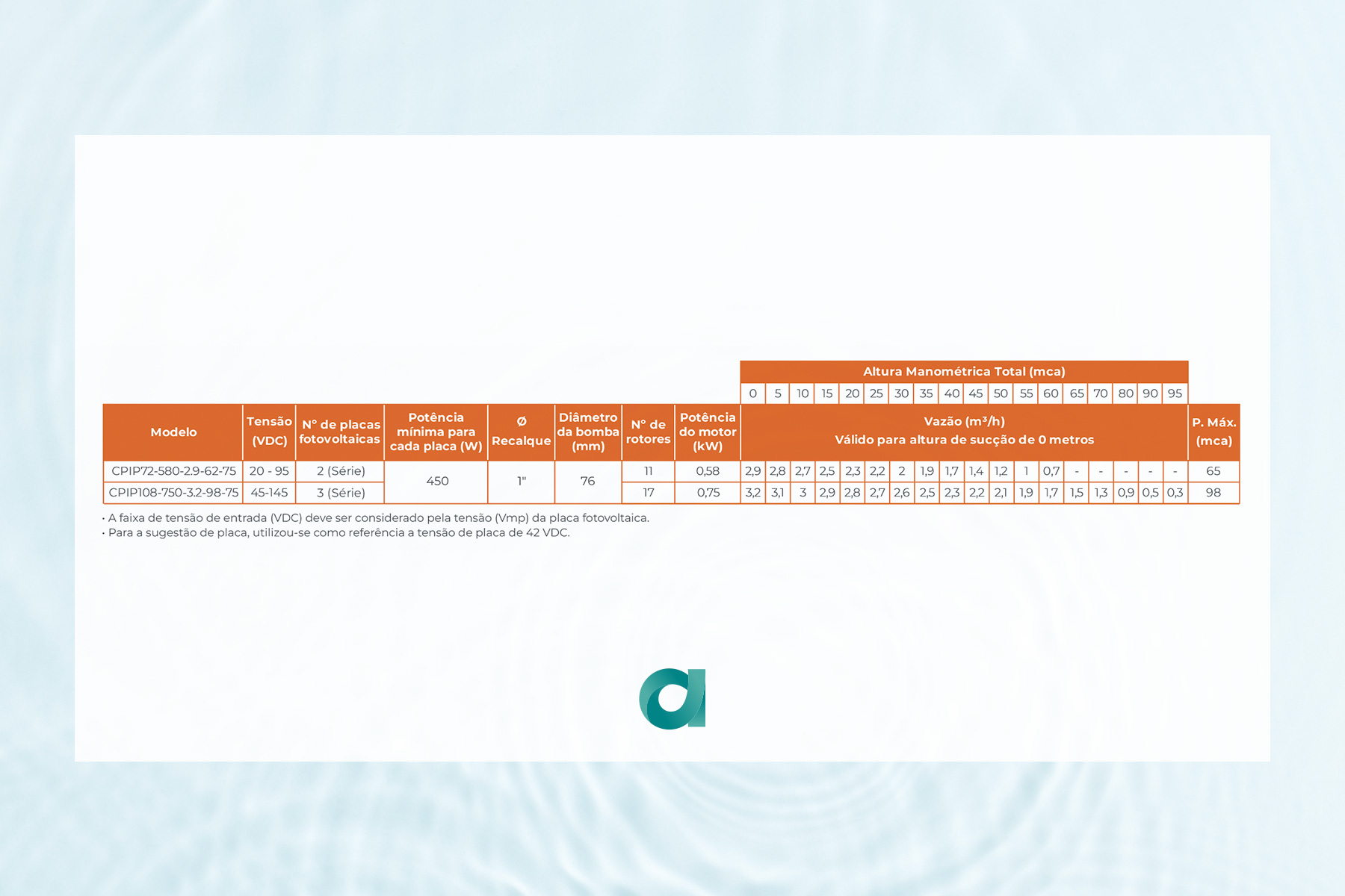 A motobomba submersa solar 3” CPIP é ideal para poços artesianos, residências, irrigações em chácaras e bebedouros de animais em locais sem rede elétrica confiável. Com corpo em aço inox, recalque em bronze, motor de corrente contínua sem escovas, enrolamento em cobre e proteção IP68, oferece alta eficiência e longa vida útil. Além disso, conta com controlador interno com função MPPT, duplo selo mecânico e operação segura em imersão de até 70 m, garantindo desempenho confiável no bombeamento de água limpa.